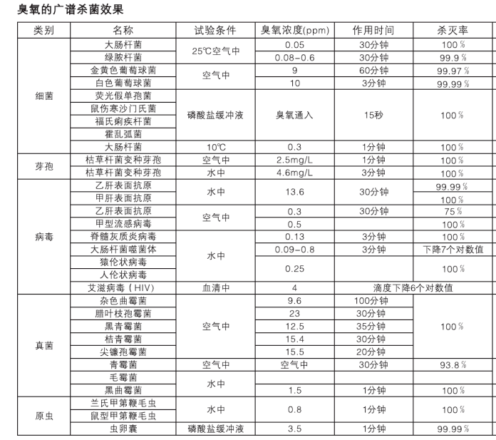 下面附表,臭氧可殺滅的菌種及效果: